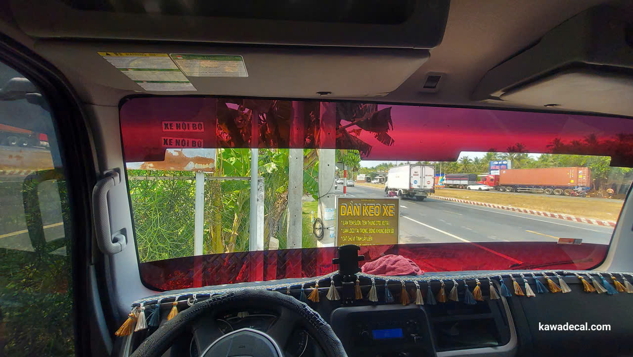 Film đỏ dán kính trước JAC 750 Plus, chuyên chống chói nắng từ phía trên chiếu xuống – giảm lóa mắt, nhìn đường dễ hơn, chạy đường dài đỡ mệt.